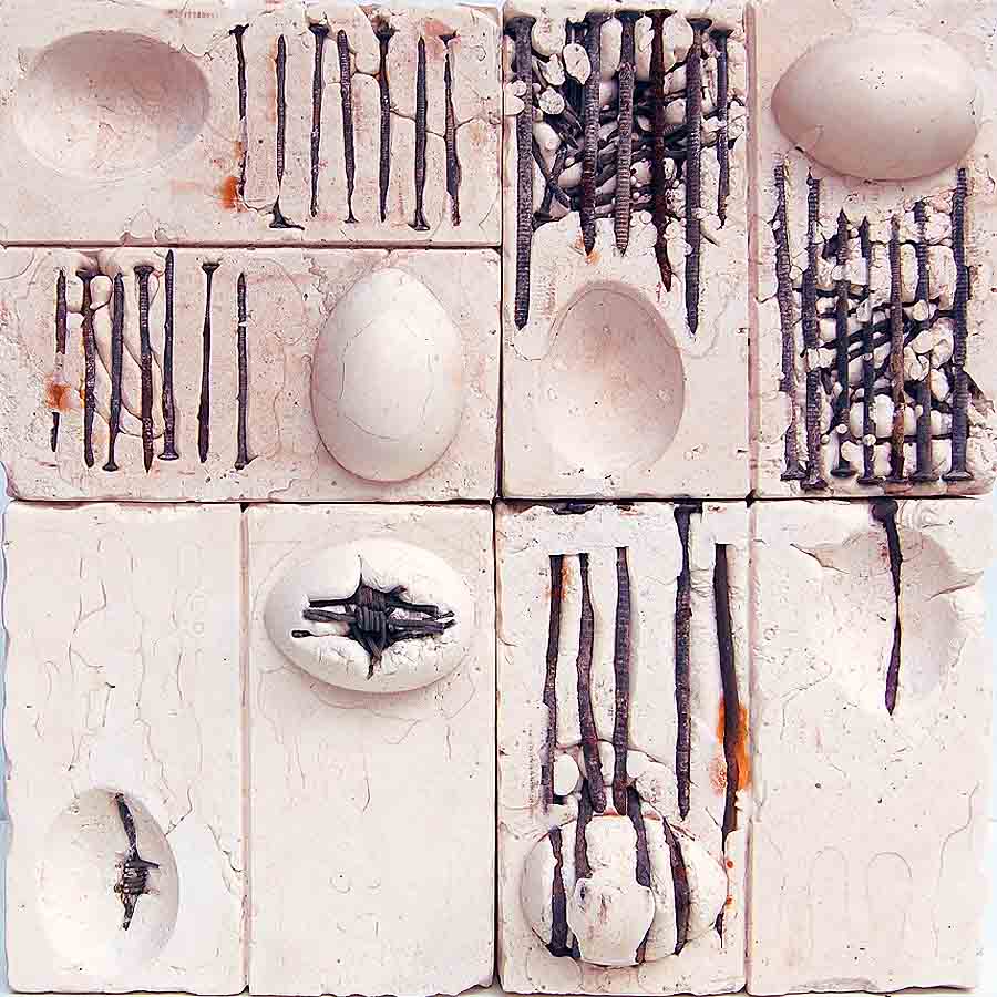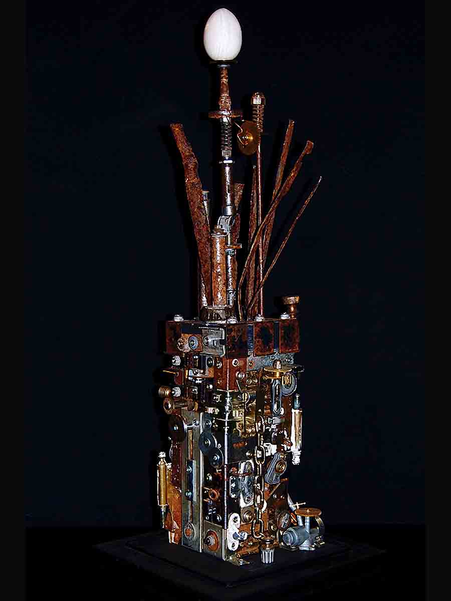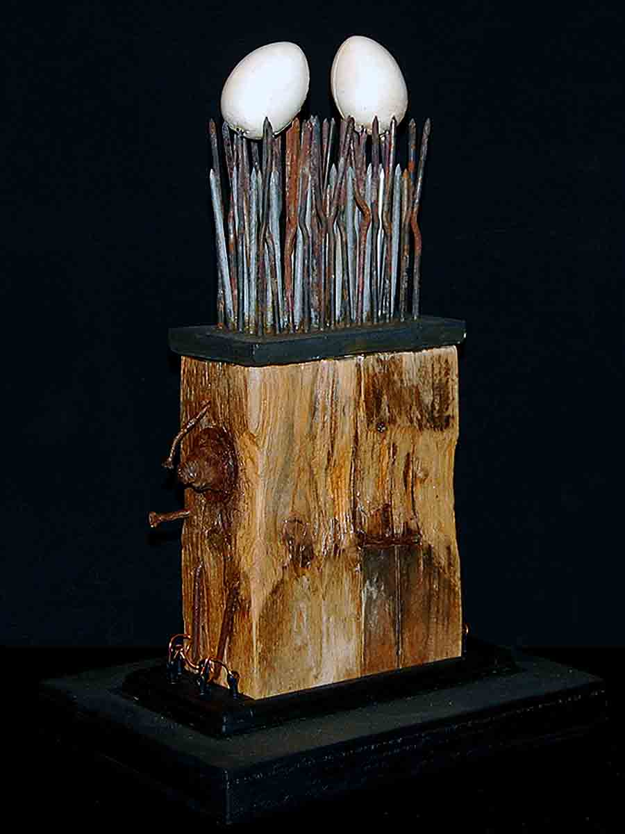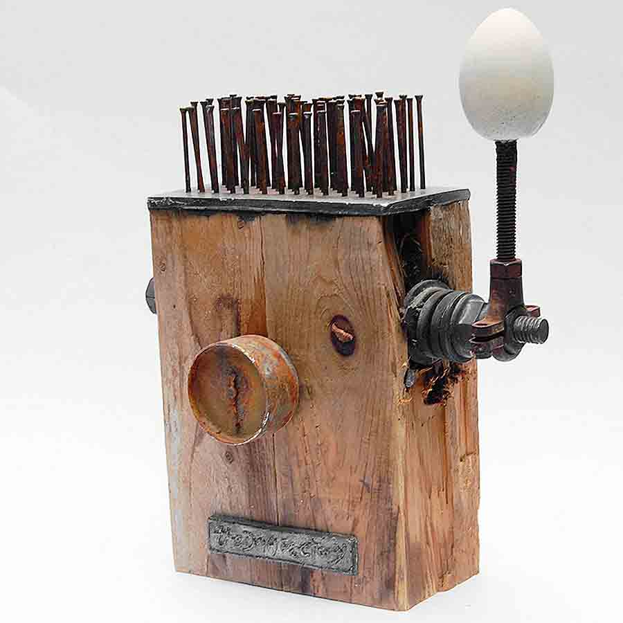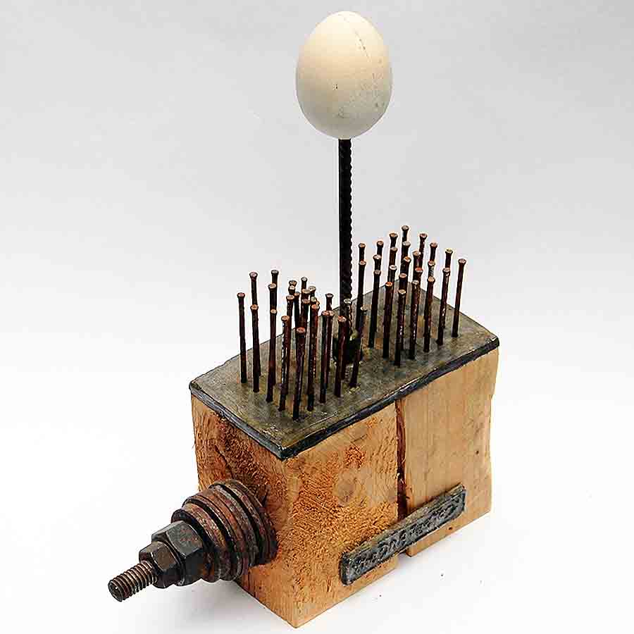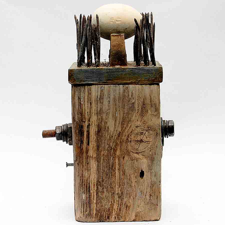 Initially developed and created as a series throughout the lockdown of 20-21, the members of this family deploy the symbol of an egg to represent the fragility of life. This group of sculptures, along with Heroes Of Isolation and Erosion Apostles completed during the same time period, saw the introduction of a wider range of materials including plaster, concrete and Jesmonite, marrying these with found and reclaimed items including recycled wood, steel, machine parts alongside rusted and burned nails, bicycle chains and ash. Developments of this collection are still on-going into 2025/26 and have developed into larger works clad and bound in metals and materials recycled from luxury brand waste.