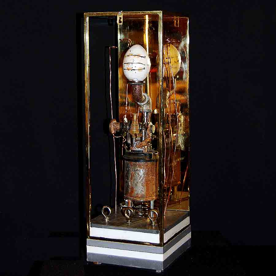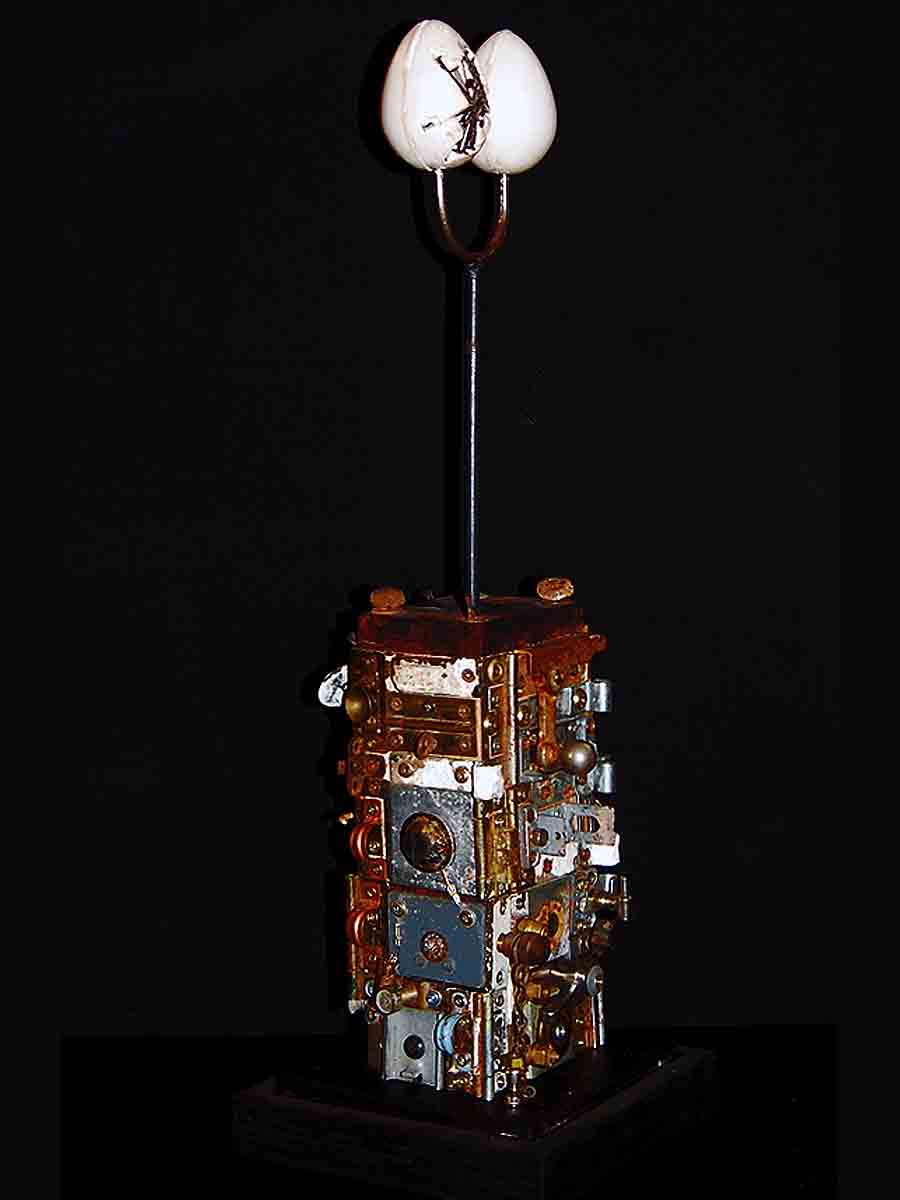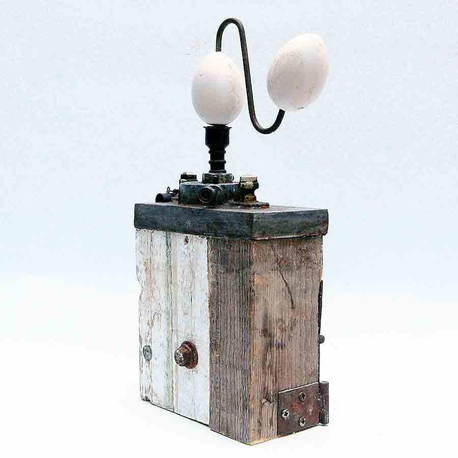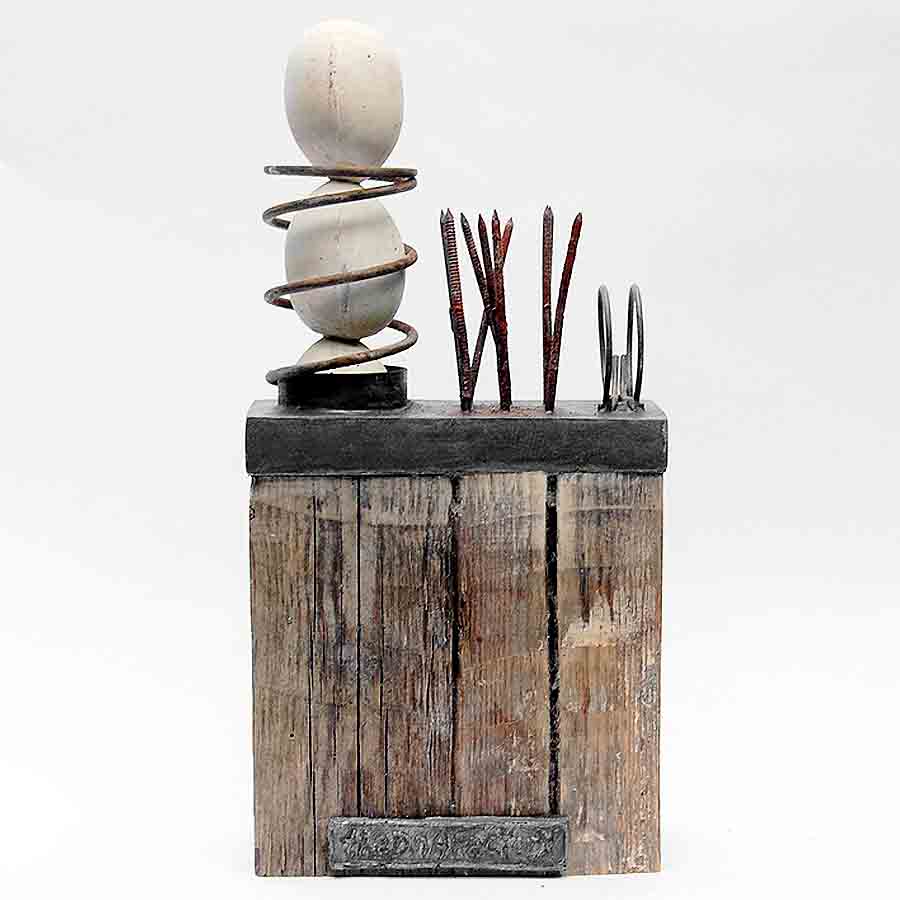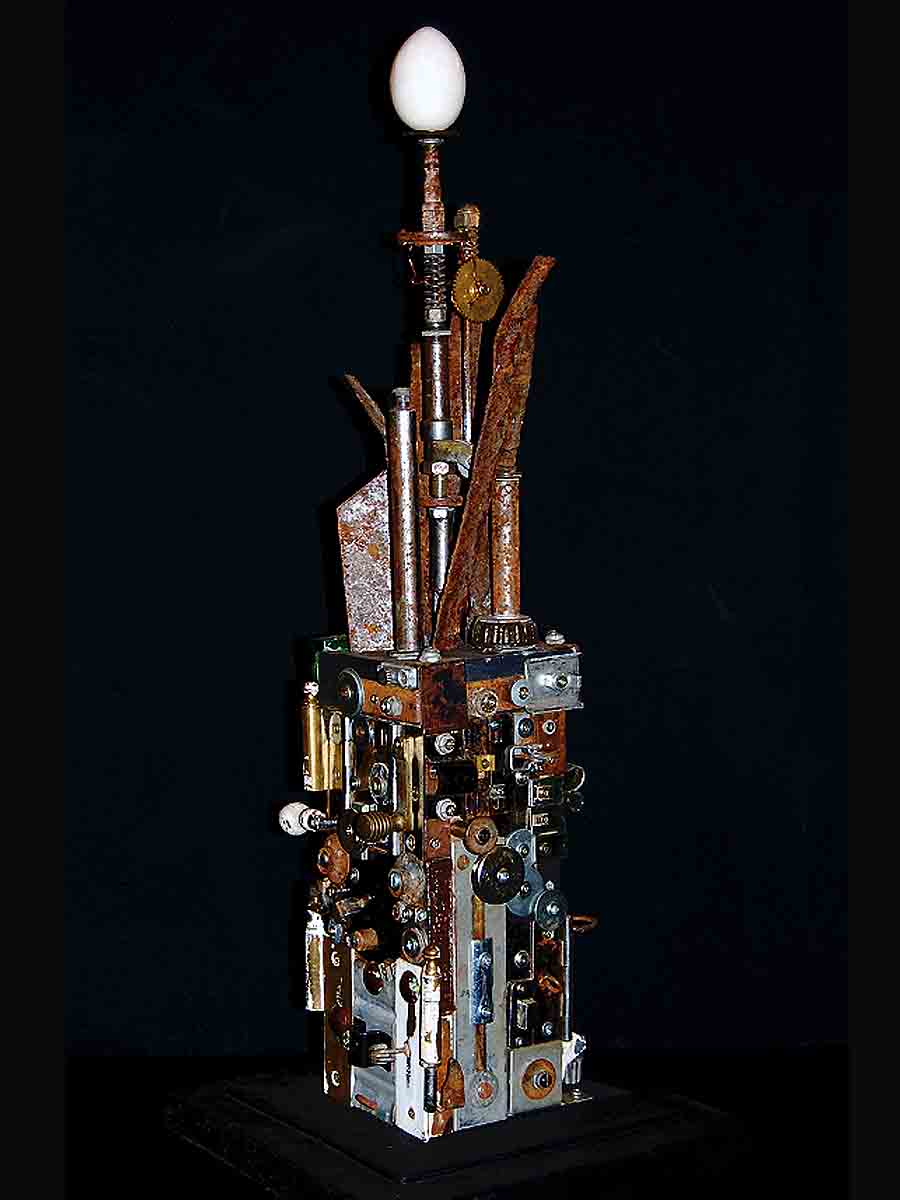 Initially developed and created as a series throughout the lockdown of 20-21, the members of this family deploy the symbol of an egg to represent the fragility of life. This group of sculptures, along with Heroes Of Isolation and Erosion Apostles completed during the same time period, saw the introduction of a wider range of materials including plaster, concrete and Jesmonite, marrying these with found and reclaimed items including recycled wood, steel, machine parts alongside rusted and burned nails, bicycle chains and ash. Developments of this collection are still on-going into 2025/26 and have developed into larger works clad and bound in metals and materials recycled from luxury brand waste.