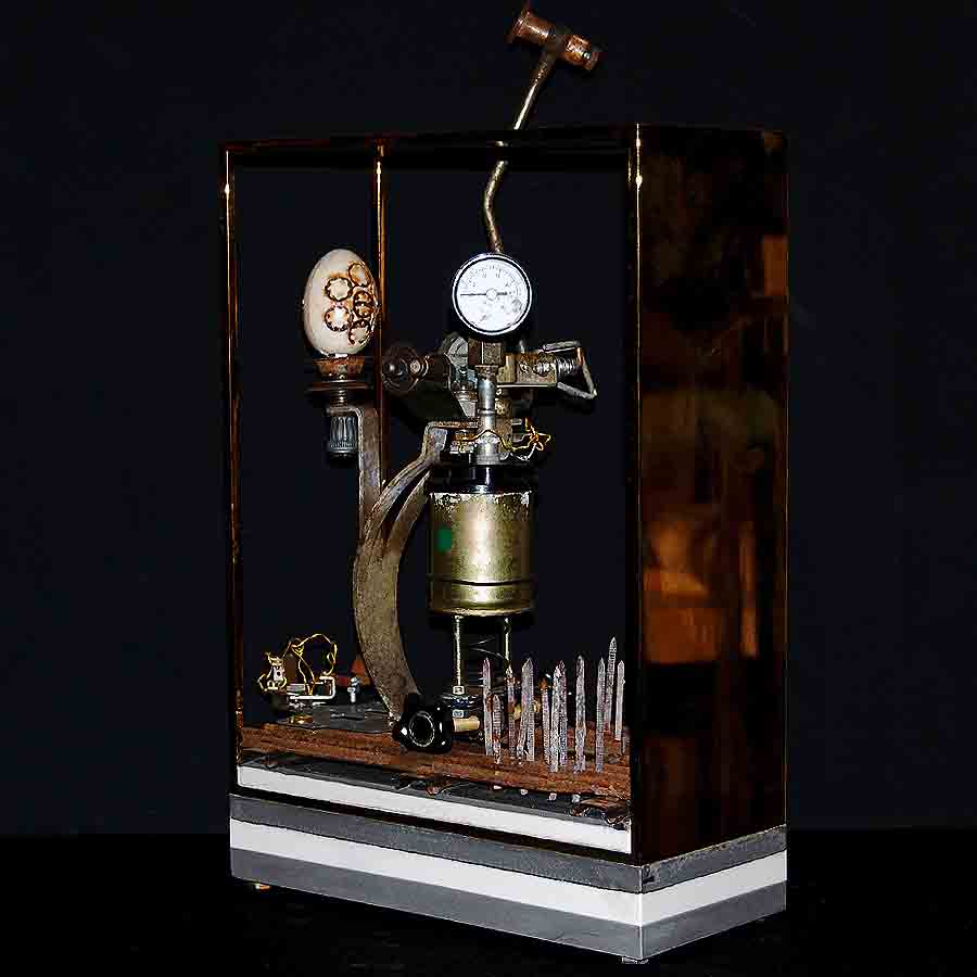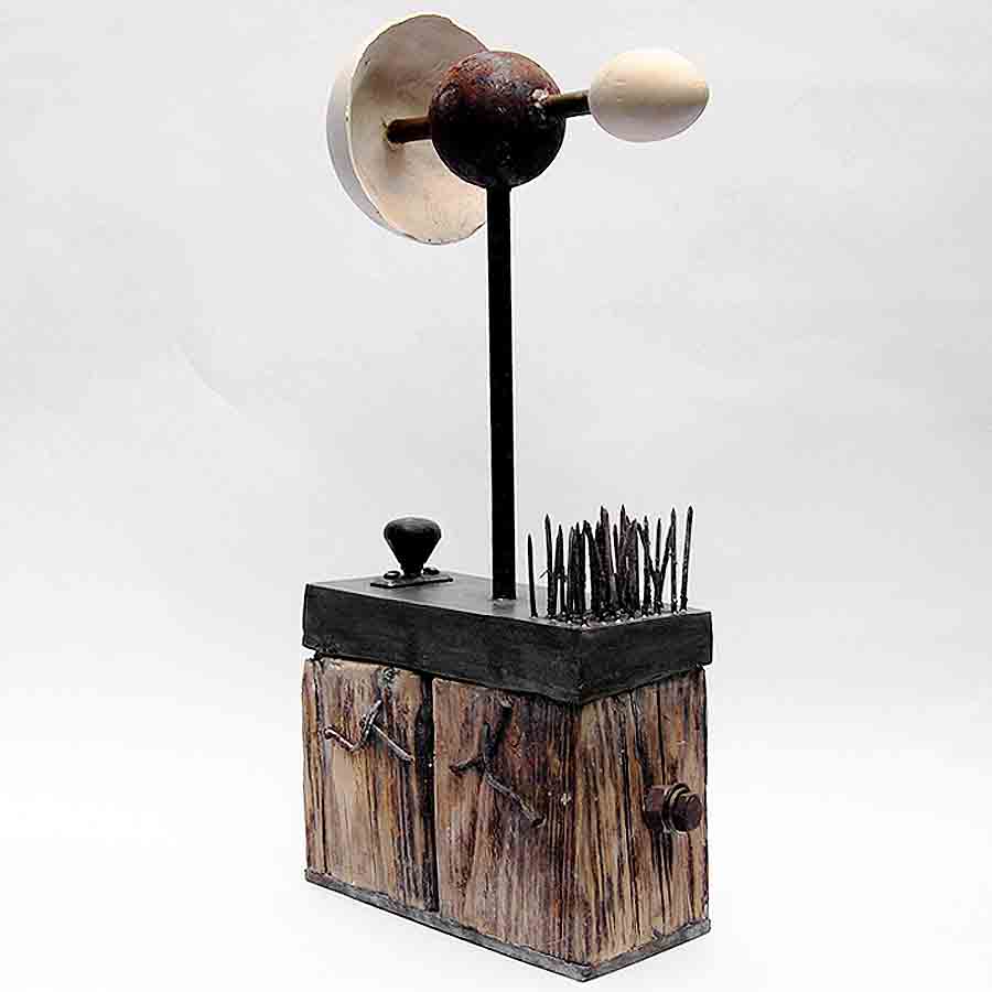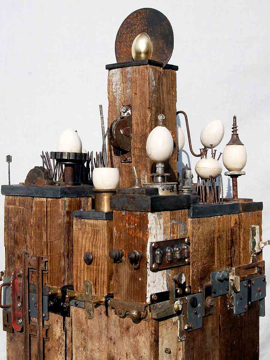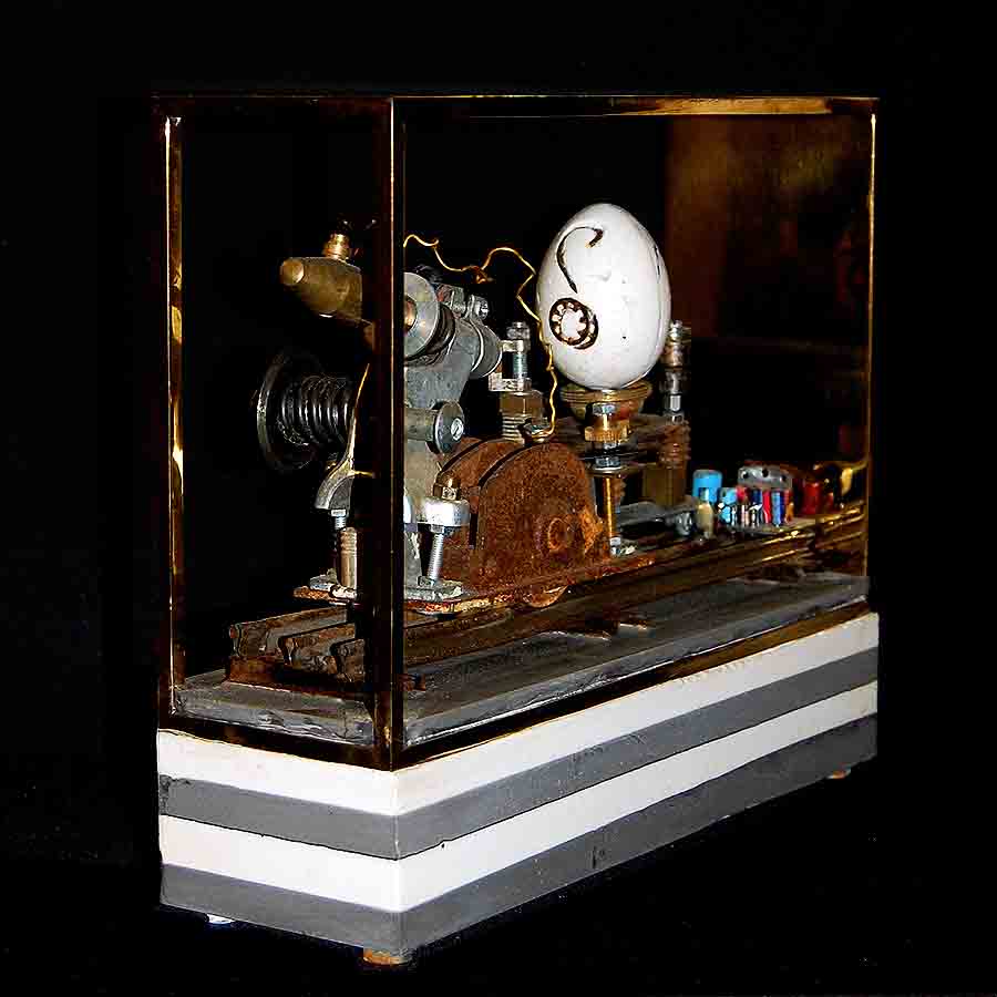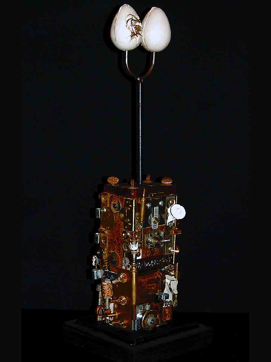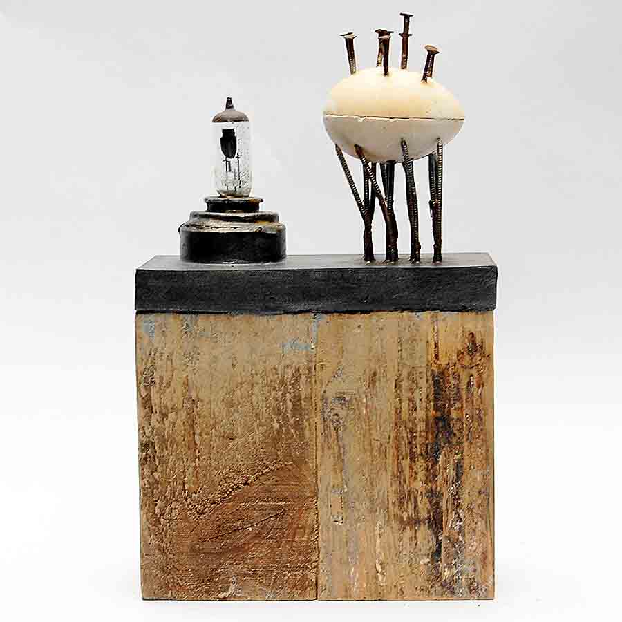 Initially developed and created as a series throughout the lockdown of 20-21, the members of this family deploy the symbol of an egg to represent the fragility of life. This group of sculptures, along with Heroes Of Isolation and Erosion Apostles completed during the same time period, saw the introduction of a wider range of materials including plaster, concrete and Jesmonite, marrying these with found and reclaimed items including recycled wood, steel, machine parts alongside rusted and burned nails, bicycle chains and ash. Developments of this collection are still on-going into 2025/26 and have developed into larger works clad and bound in metals and materials recycled from luxury brand waste.