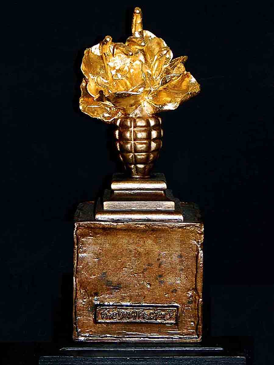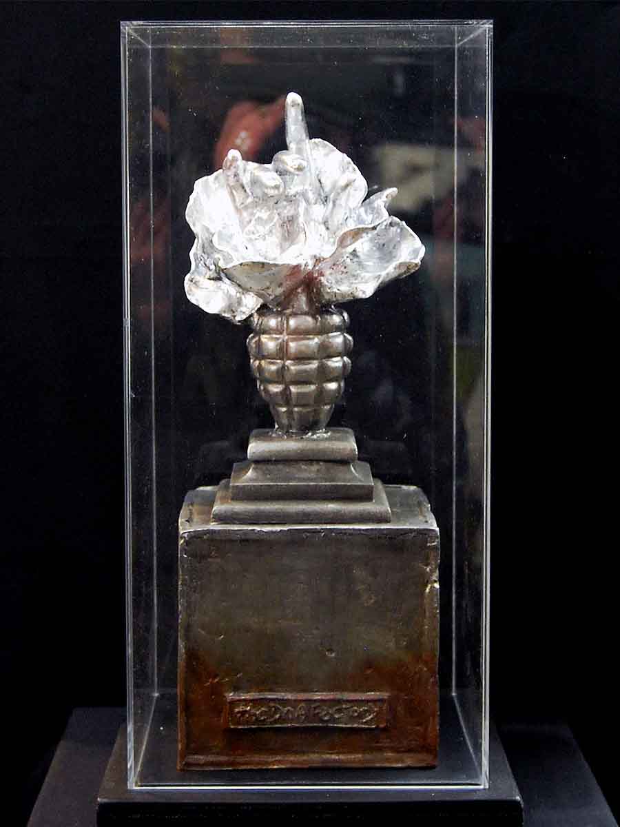 We decided to develop this particular symbol, merging the hand and flower motif with a cast of a WWII hand grenade to create a ‘trophy’, an award to those who strive towards peace over hostility.