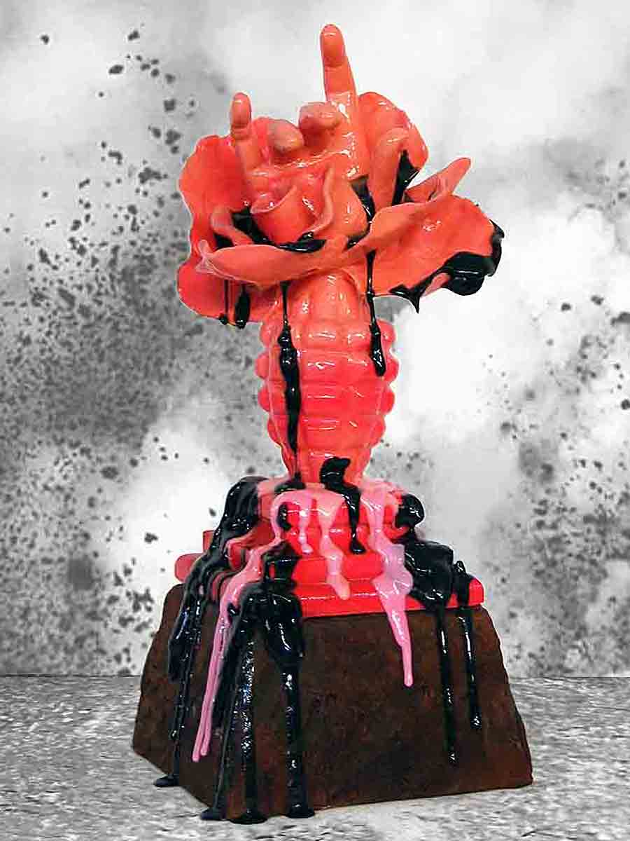 The first incarnation of the series in 2014 were as red/pink candy coloured resin, slick with dripping black oil and spoke of corporate greed, war and environmental destruction in the quest for fossil fuels.