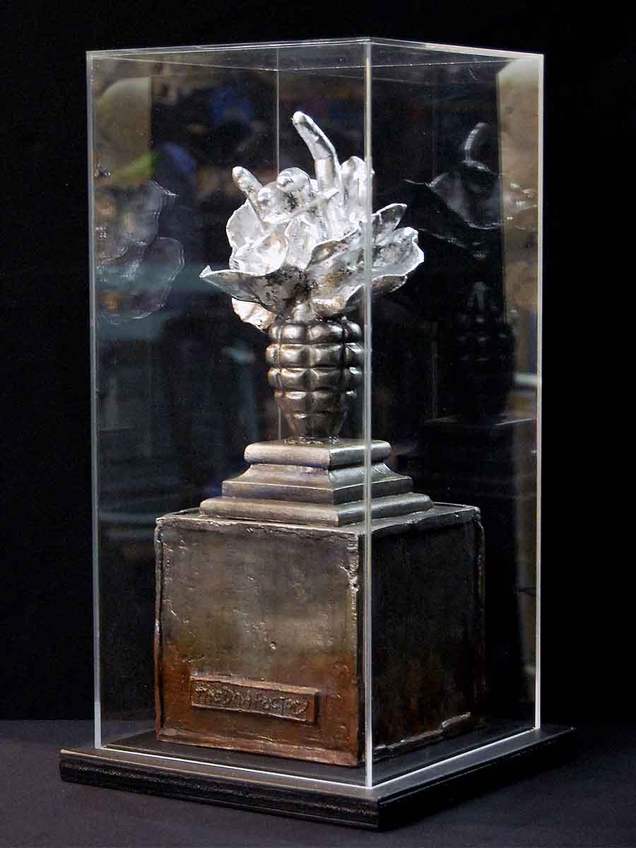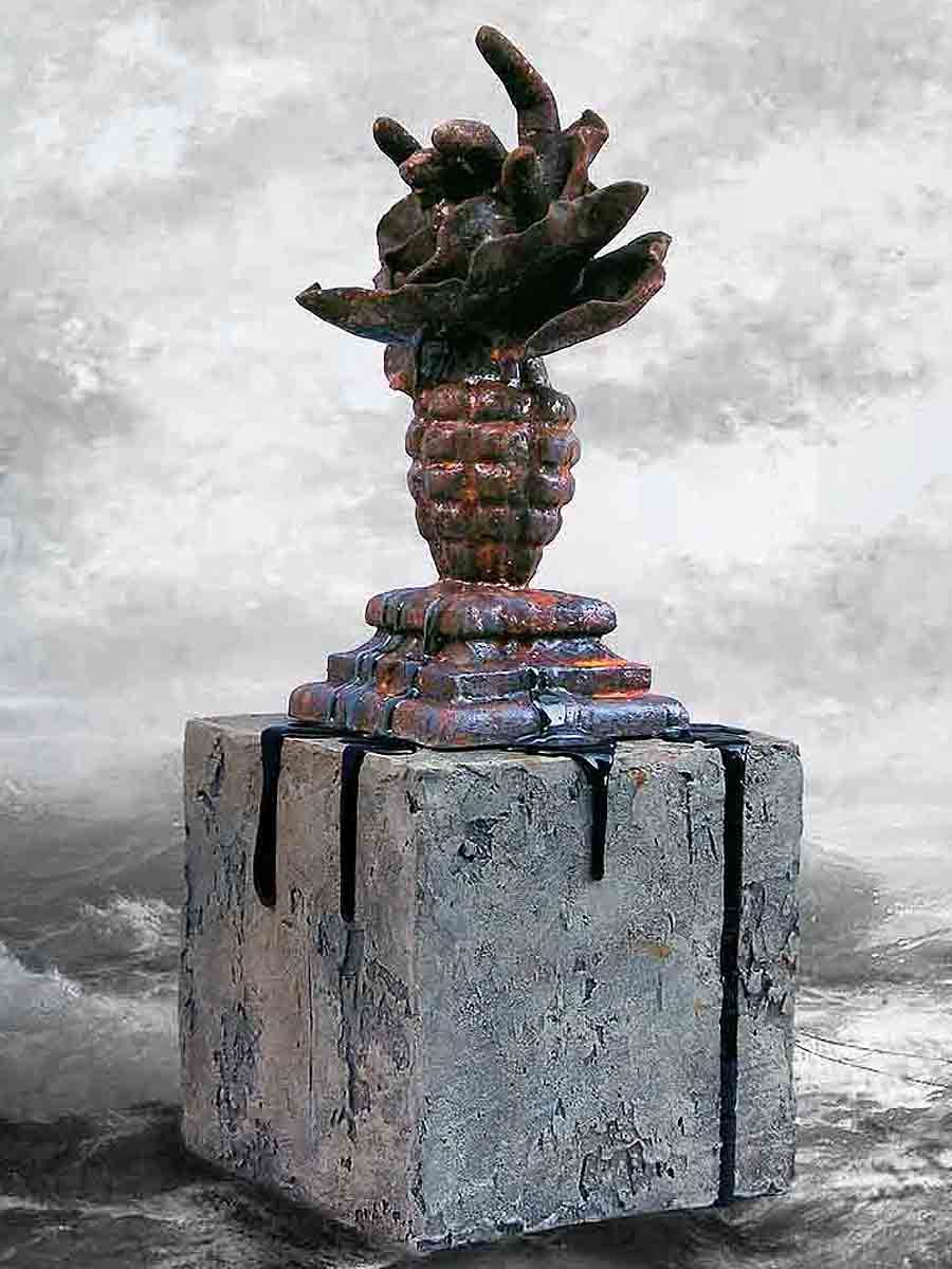 As a symbol, the power that HandFlowerGrenade embodies is simple, evident and direct. This quality allows us to experiment with the same form in a variety of different finishes and presentations over the years from corroded metal and concrete [2016] to the fanciful High Hopes and Cease Fire diptych [2021] and the two versions of the V23 studies one with silver leaf over a steel finish recently exhibited as part of ‘Reality Check’, the Summer Exhibition at The Royal Society Of Sculptors curated by David McAlmont, and the companion with gold leaf over a bronze finish.