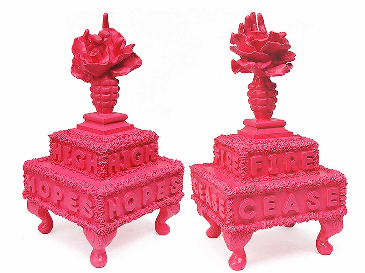The first HandFlowerGrenades were created as a series of multiples in 2014, born from a previous large scale temporary public sculpture sited firstly in Spitalfields’ and then the upper level of Somerset House along the Embankment; the work ‘The Poetry Of Life’ was created for the BTArtBox campaign in support of ChildLine in 2012 and deployed a plethora of sculpted hands emerging from roses as symbols of hope.